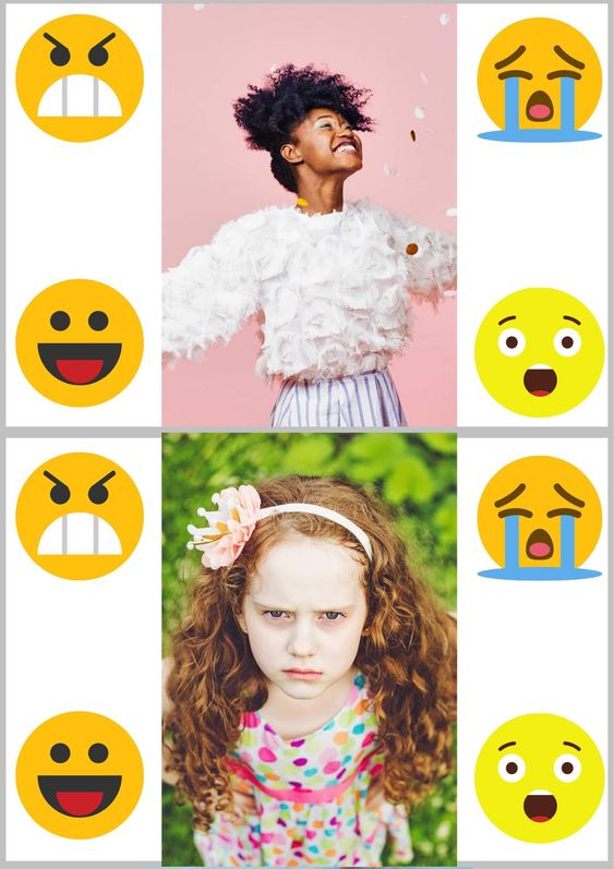 Znajdź właściwą emocję, połącz lub otocz kółkiem emotkę pasującą do zdjęcia.