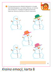- Wykonanie ćwiczenia z KE (Kraina Emocji), karta 8. Dzieci siedzą przy stolikach. Nauczyciel prosi, żeby przyjrzały się ilustracjom, odszukały smutne bałwanki, które nie mają kapeluszy i dokleiły im brakujące nakrycia głowy. Następnie dzieci dorysowują uśmiechy na buziach bałwanków. Po skończonym zadaniu nauczyciel podchodzi do każdego dziecka i chwali jego zaangażowanie.