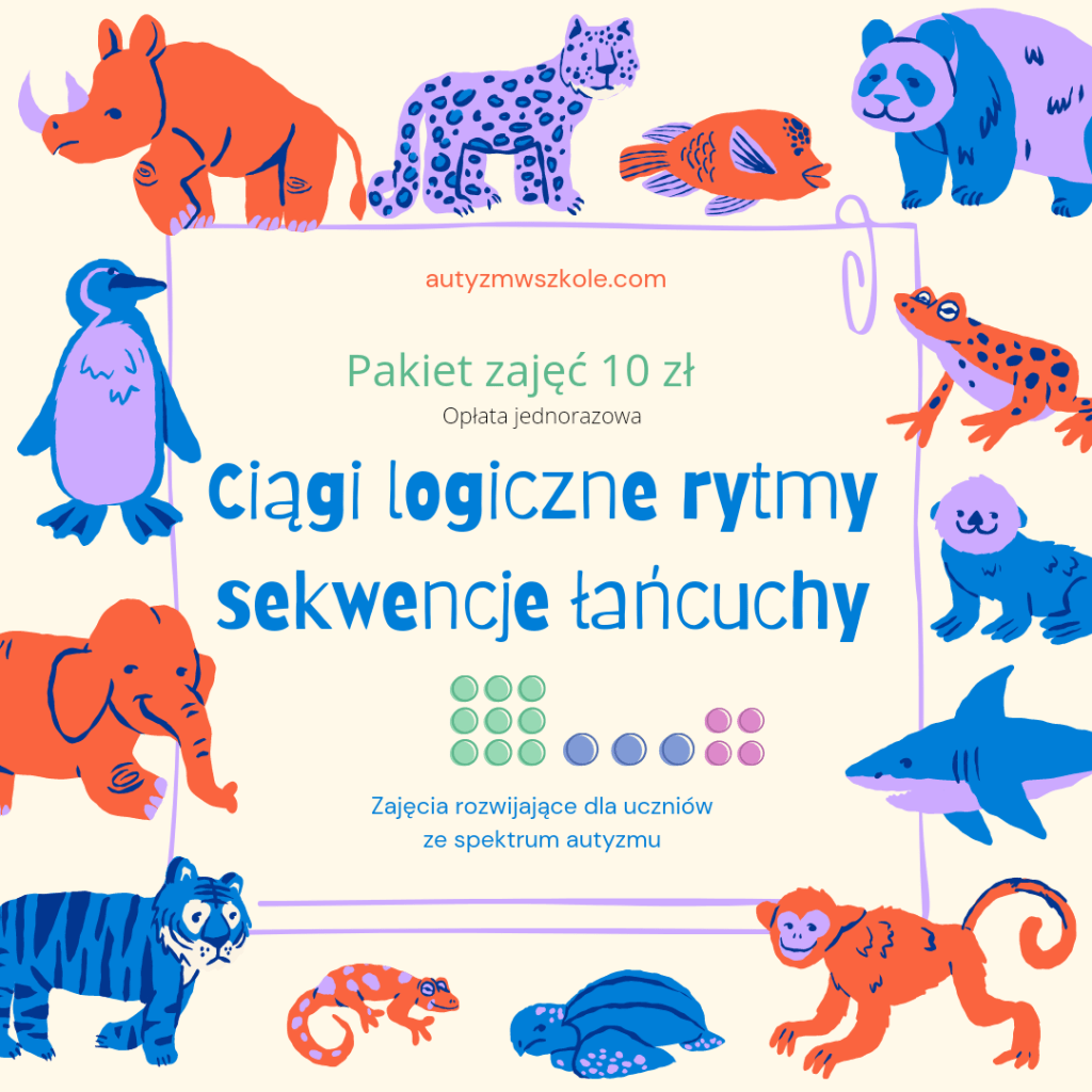Pakiet ciągi logiczne sekwencje rytmy – zajęcia rozwijające dla uczniów ze spektrum autyzmu 10 zł – to dobre narzędzie do prowadzenia zajęć rewalidacyjnych zawartych w programach kompensacyjnych; terapeutycznych typu IPET – rozwijających percepcję wzrokową i logiczne myślenie. Ćwiczenia/materiały są również dostosowane do pracy z dzieckiem w domu.