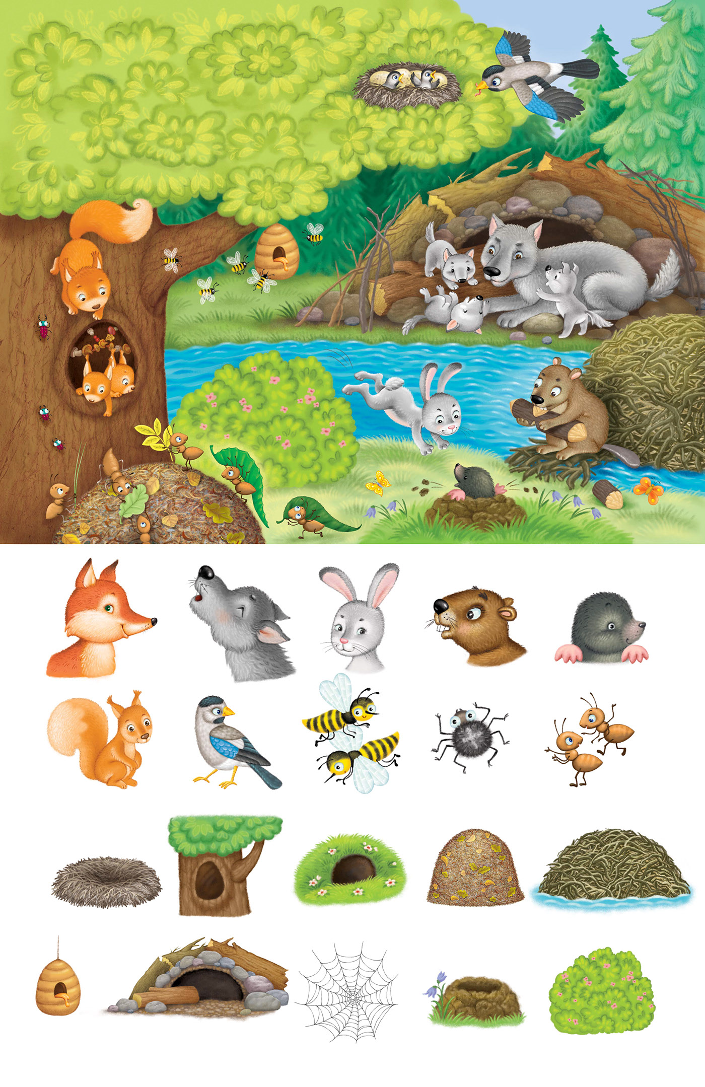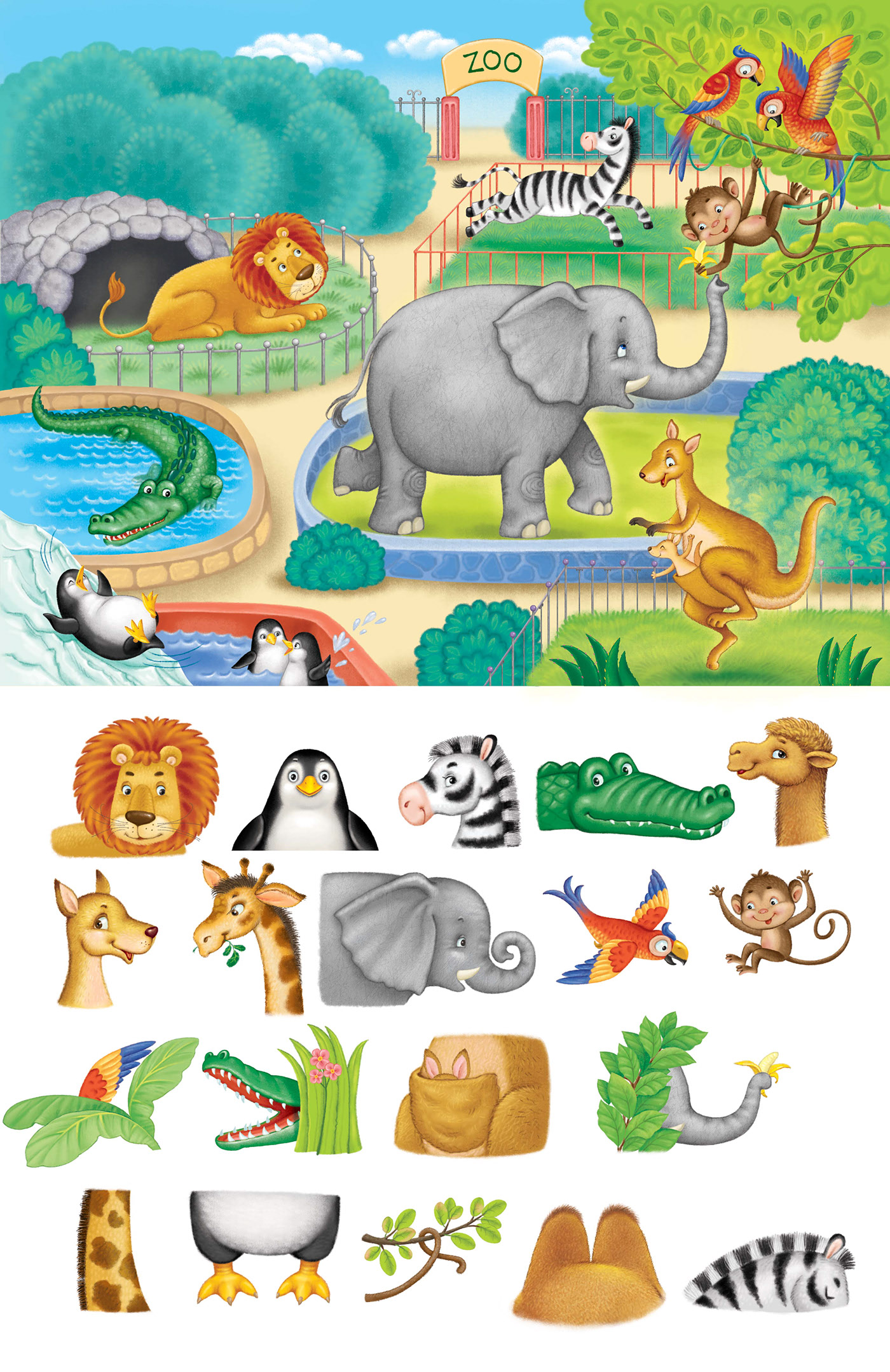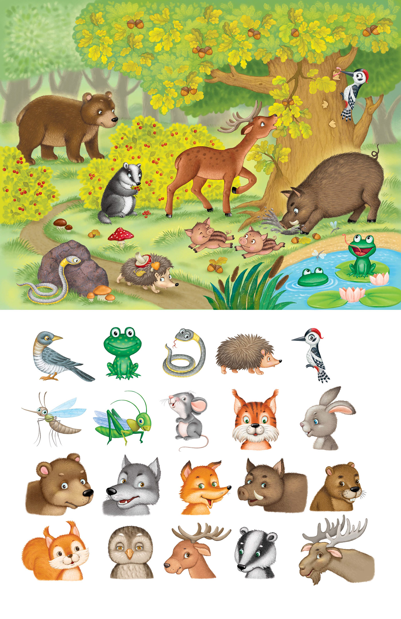 Możesz powiedzieć, że to zwierzęta, które żyją w lesie/ zoo/zagrodzie… itp. Rozpoznajesz jakieś? Ja rozpoznaję dzięcioła. Dzięcioł stuka w korę drzewa szukając robaczków do zjedzenia. Robi dużo hałasu w lesie. Puka dziobem w drzewa. Puk, puk, puk, puk. Ma piękne kolory… itd. Możesz snuć swoje historie, żeby zainteresować dziecko – ale do niczego nie zmuszaj. Uważne słuchanie i spędzanie razem czasu w miłej atmosferze otwiera inne kanały komunikacji przyswajania wiedzy i słów.
