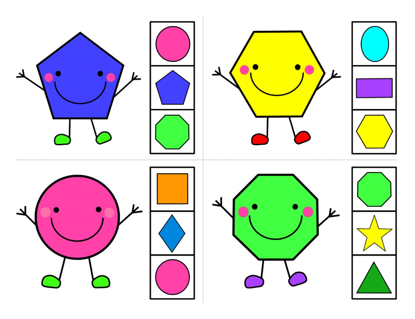 - pięciokąt, sześciokąt, koło, ośmiokąt