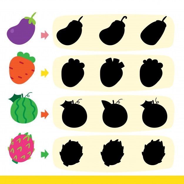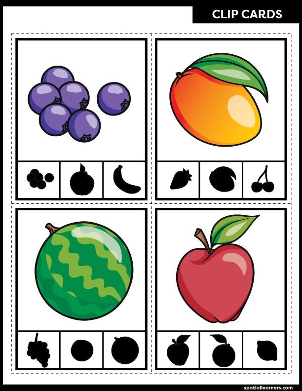 3. Rozpoznaj cień. Wytnij karty z arkusza i przypnij klamerki w odpowiednim miejscu. Jaki kształt ma arbuz? Jaki kształt mają jagody? Które owoce są najmniejsze – a które największe?