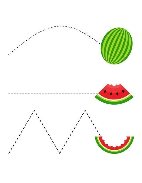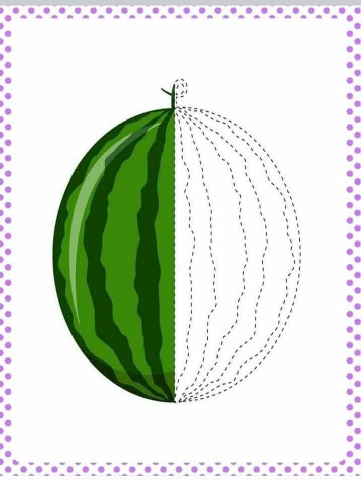 6. Symetria. Rysuj po śladzie. Pokoloruj arbuza według wzoru. Jakich kolorów użyłeś/użyłaś? Którą stronę pokolorowałeś/łaś, prawą czy lewą?