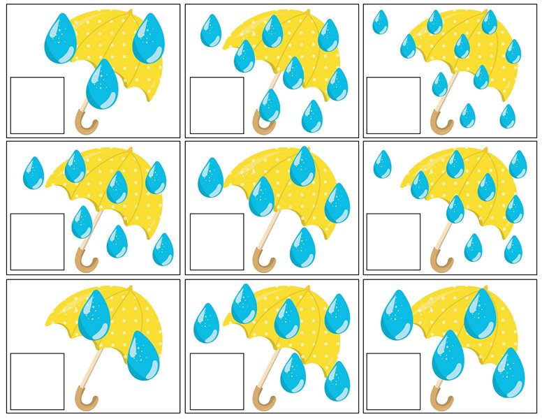 Środki dydaktyczne: wiersz (autor nieznany) pt. „Deszczyk pada”, chusta animacyjna, wiatrak matematyczny, kartonowe parasole, krople deszczu, piłki