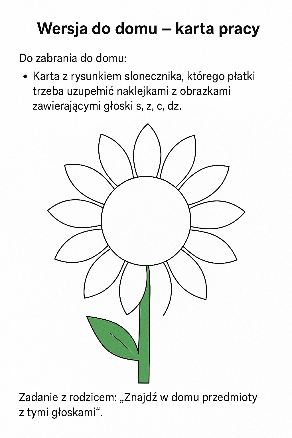 📄 Karta z rysunkiem słonecznika, którego płatki trzeba uzupełnić naklejkami z obrazkami zawierającymi głoski s, z, c, dz.