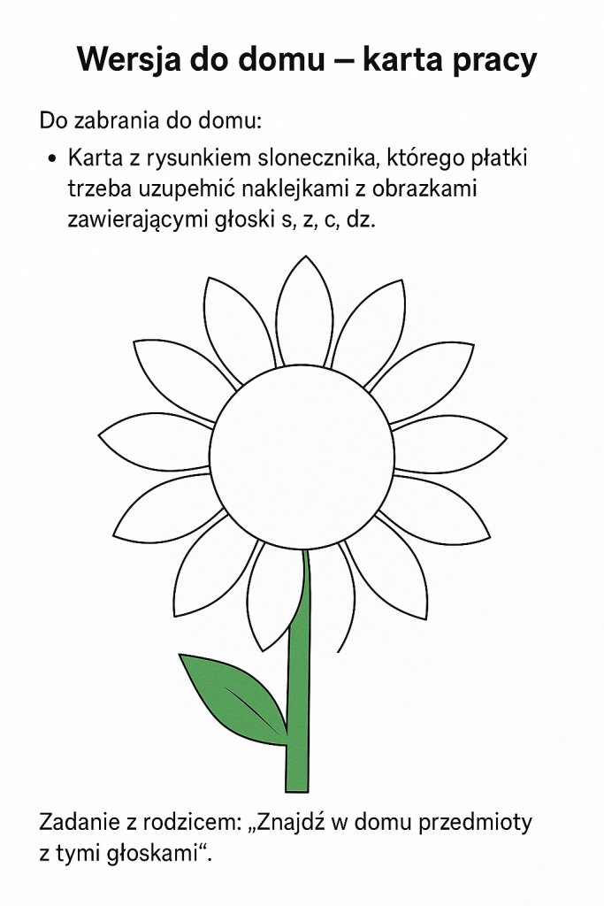 - Na każdym płatku – obrazek i słowo z głoską: s, z, c, dz (np. sowa, zamek, cukierki, dzik)