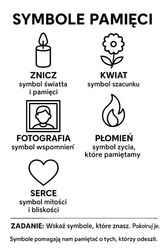 - Uczeń rozpoznaje i nazywa przynajmniej jeden symbol pamięci (np. znicz, kwiat) związany z tradycją upamiętniania zmarłych.