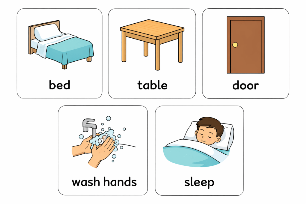 Przedmioty i czynności: łóżko, stół, drzwi, myć ręce, spać.