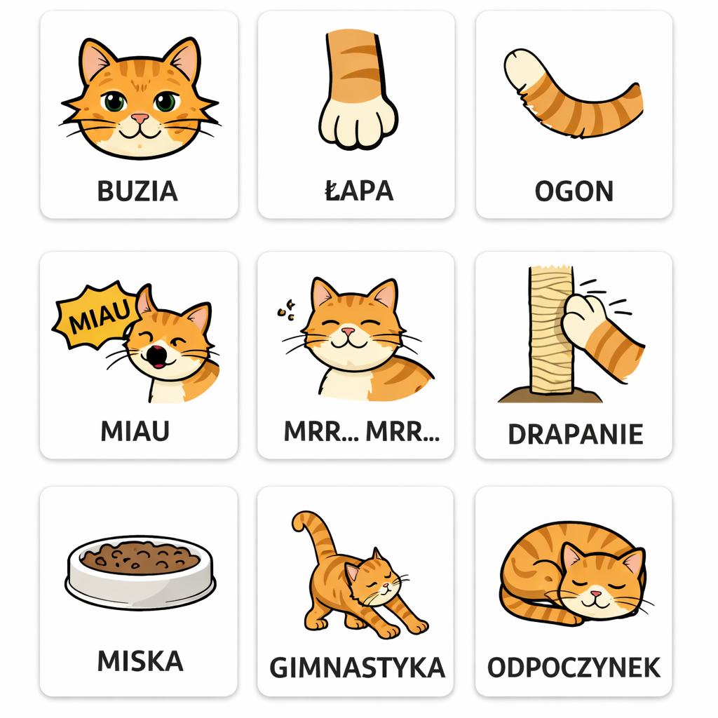 - Używanie gestów do słów (np. „mruczę” – ręce przy szyi)