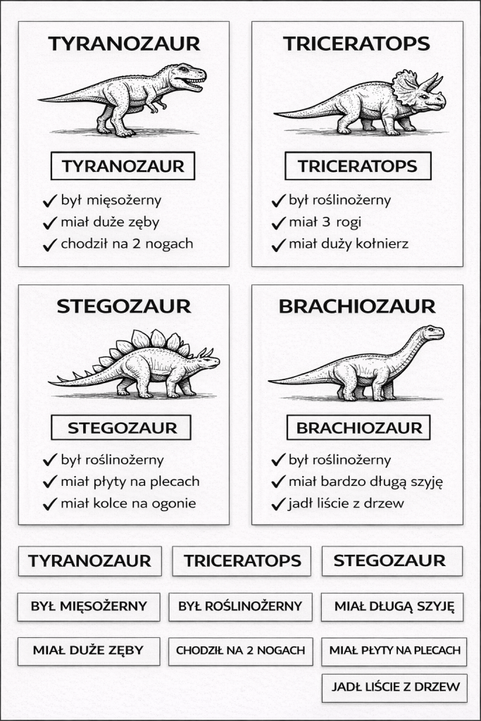 🧩 Materiały: karty obrazkowe z dinozaurami + krótkimi faktami