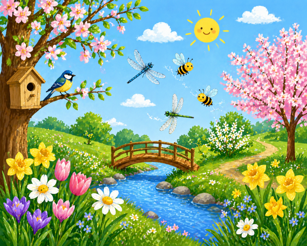 Na obrazku widzimy piękny wiosenny dzień. Świeci słońce, a niebo jest jasne i spokojne. Drzewa są pokryte kwiatami, a wokół rośnie dużo kolorowych roślin. Nad łąką latają pszczoły i ważki. Rzeka płynie przez środek krajobrazu, a wszystko wygląda spokojnie i radośnie. Wiosna to czas, kiedy przyroda budzi się do życia.